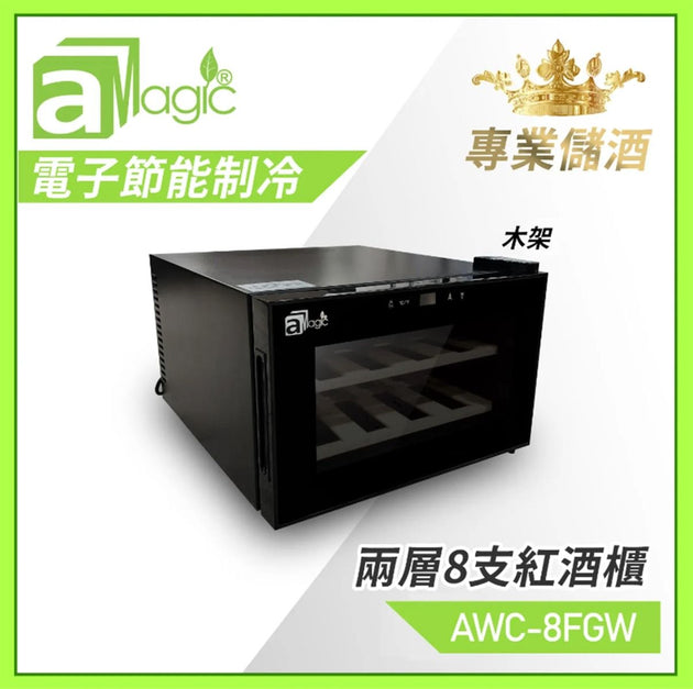 aMagic 23升(L) 橫濶身紅酒櫃8枝 | 原木架 玻璃面全透 恆溫半導體電子節能制冷酒櫃 | 型號 AWC-8FGW