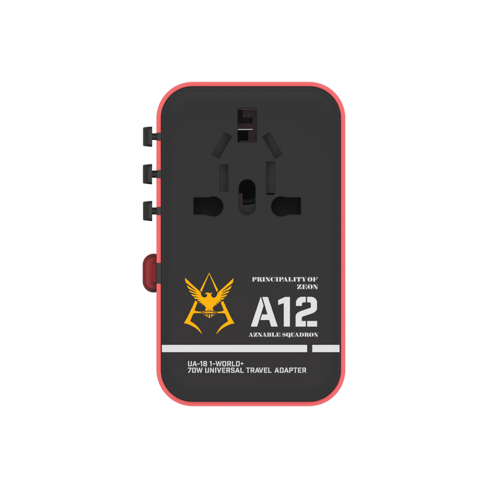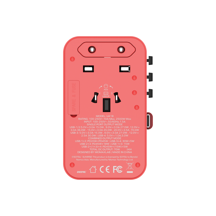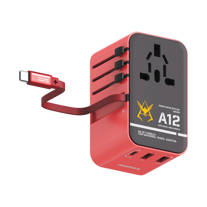 Momax X Gundam 機動戰士高達 1-World+ 70W 旅行充電插座 UA18UKGDR 以紅彗星 MS-06S 為設計靈感,內建可伸縮 USB-C 充電線,支援 70W PD 快充,採用氮化鎵(GaN)技術,動態優化電源輸出,為 MacBook、手機、筆記本電腦等裝置提供最快和最安全的充電,並配備日/美、澳、歐、英等多國插頭,適用於全球 180 個以上國家。