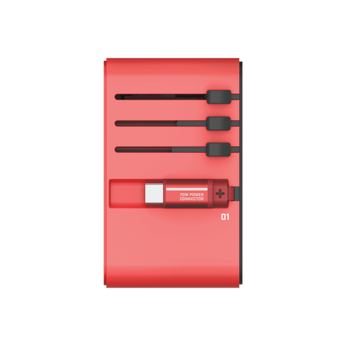 1-World+ 70W GaN 3 插口及內置伸縮USB-C 充電線旅行插座——您在任何地方的快充必備選擇。該插座配有高效且適應性強的設計,確保您的裝置能快速安全地充電。