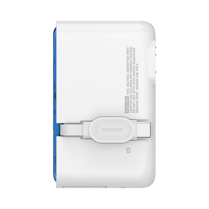 Momax X Gundam 機動戰士高達 1-World+ Flow 35W 旅行充電插座 UA21UKGDW 以高達 RX-78-2 為設計靈感,內建可伸縮 USB-C 充電線,支援 35W PD 快充,並配備日/美、澳、歐、英等多國插頭,適用於全球 180 個以上國家。