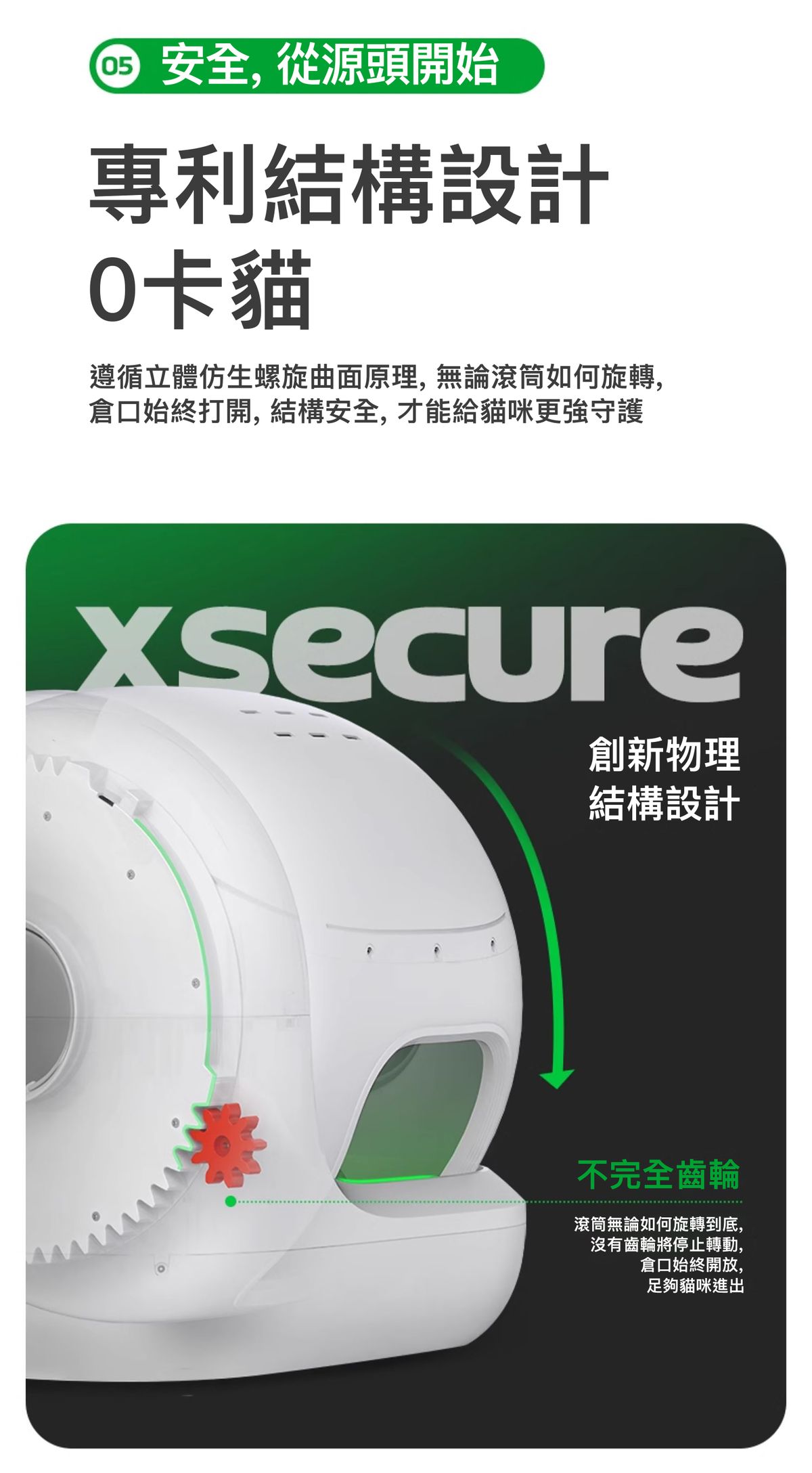 - 創新結構設計,無剪切位置,入口始終開放,安全不卡貓