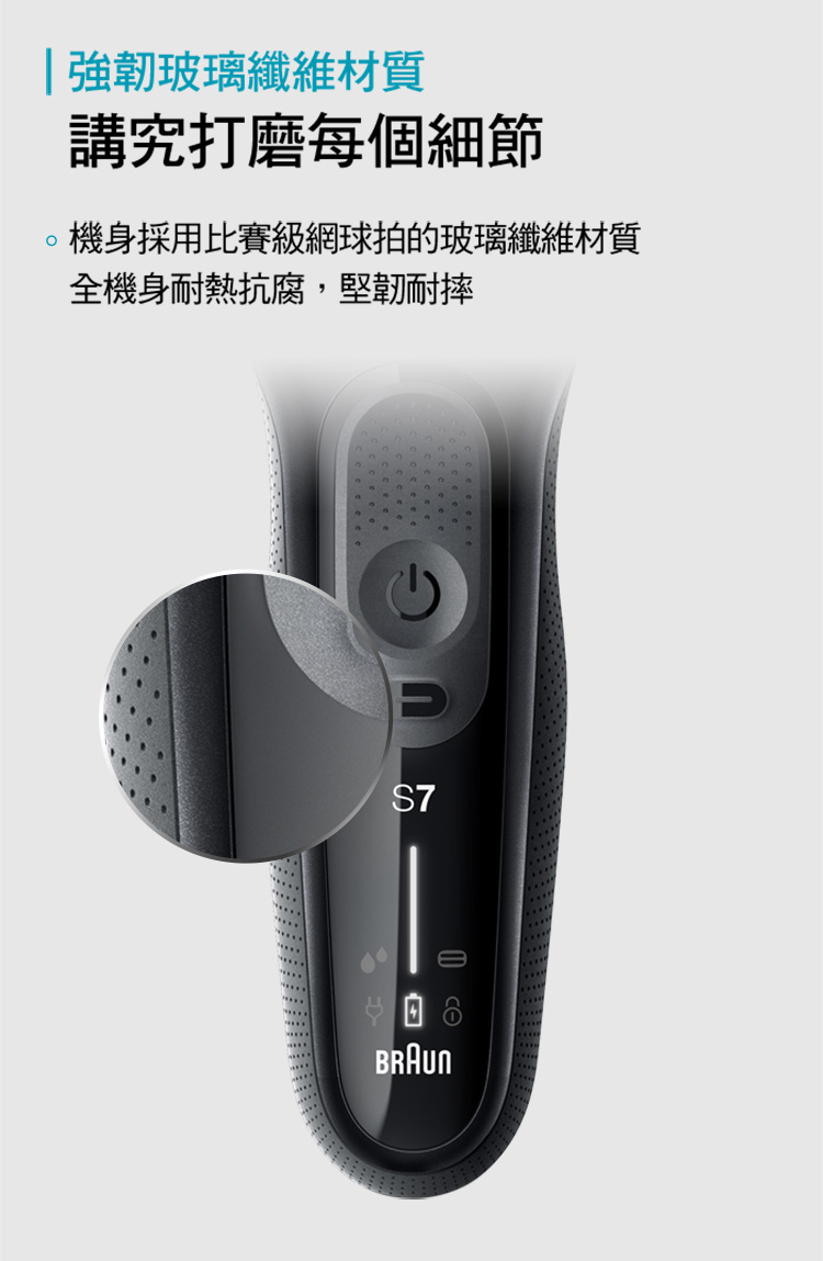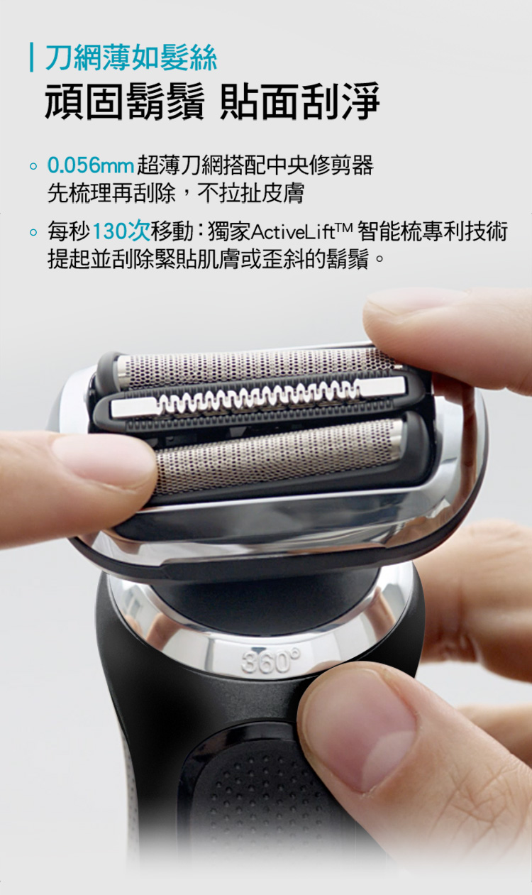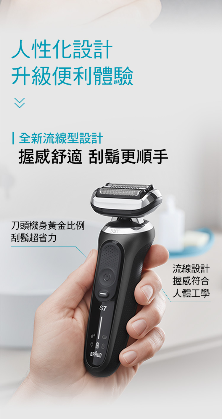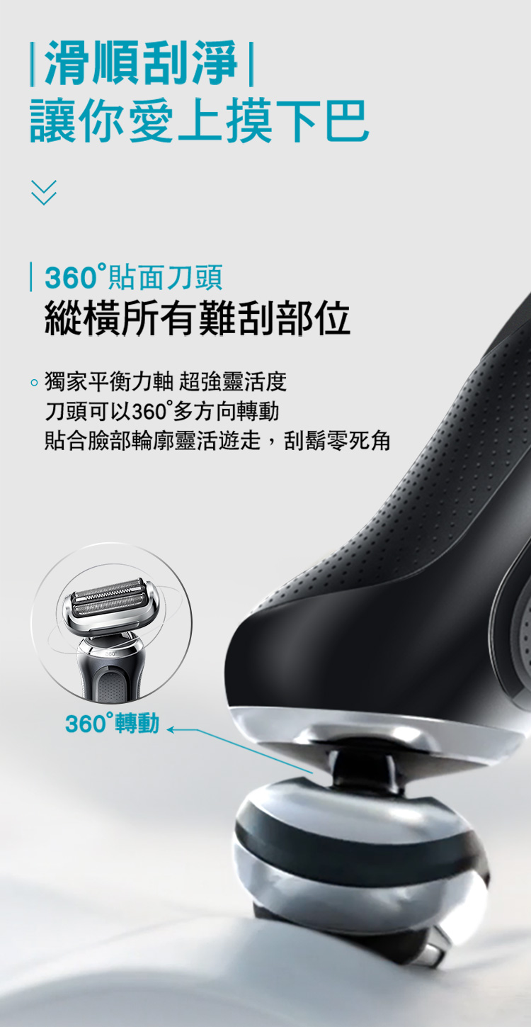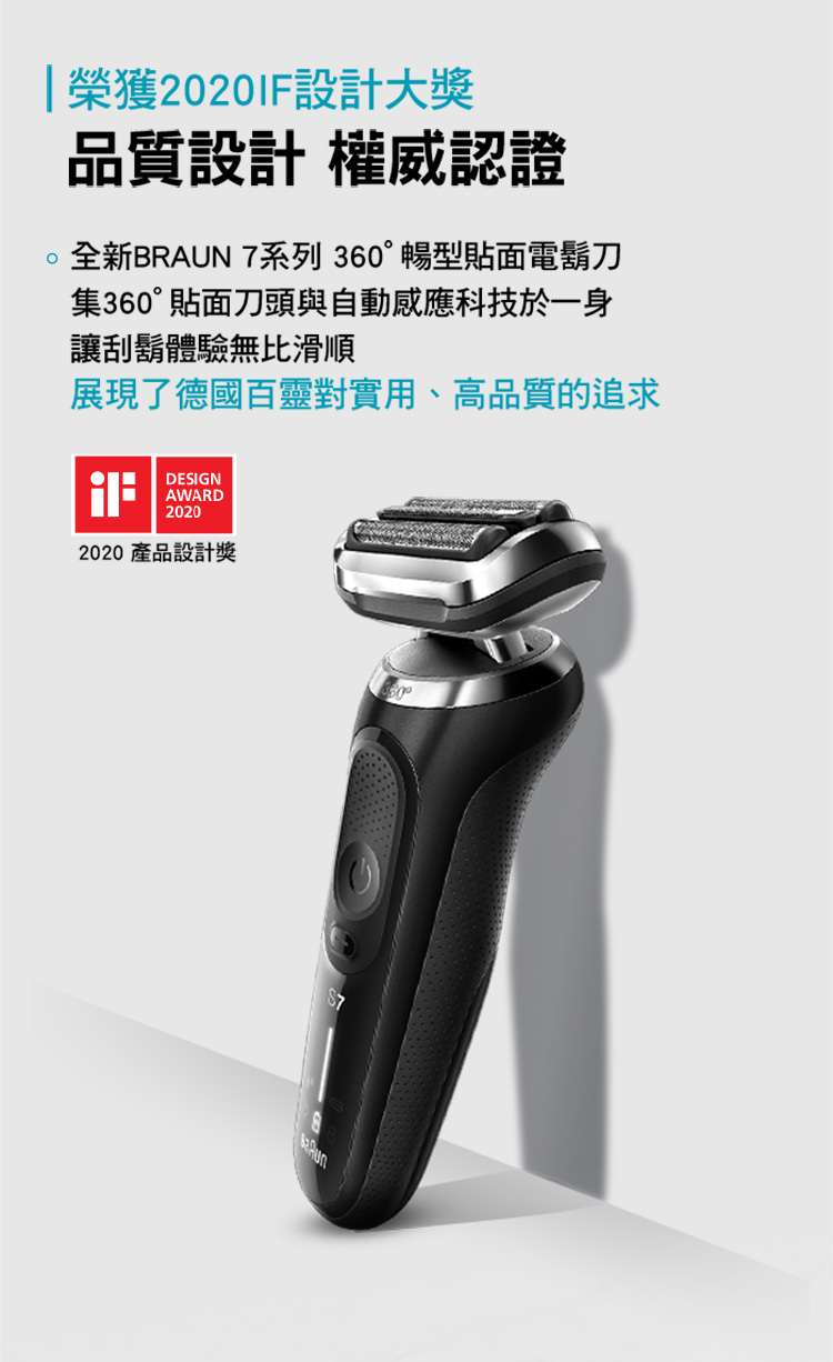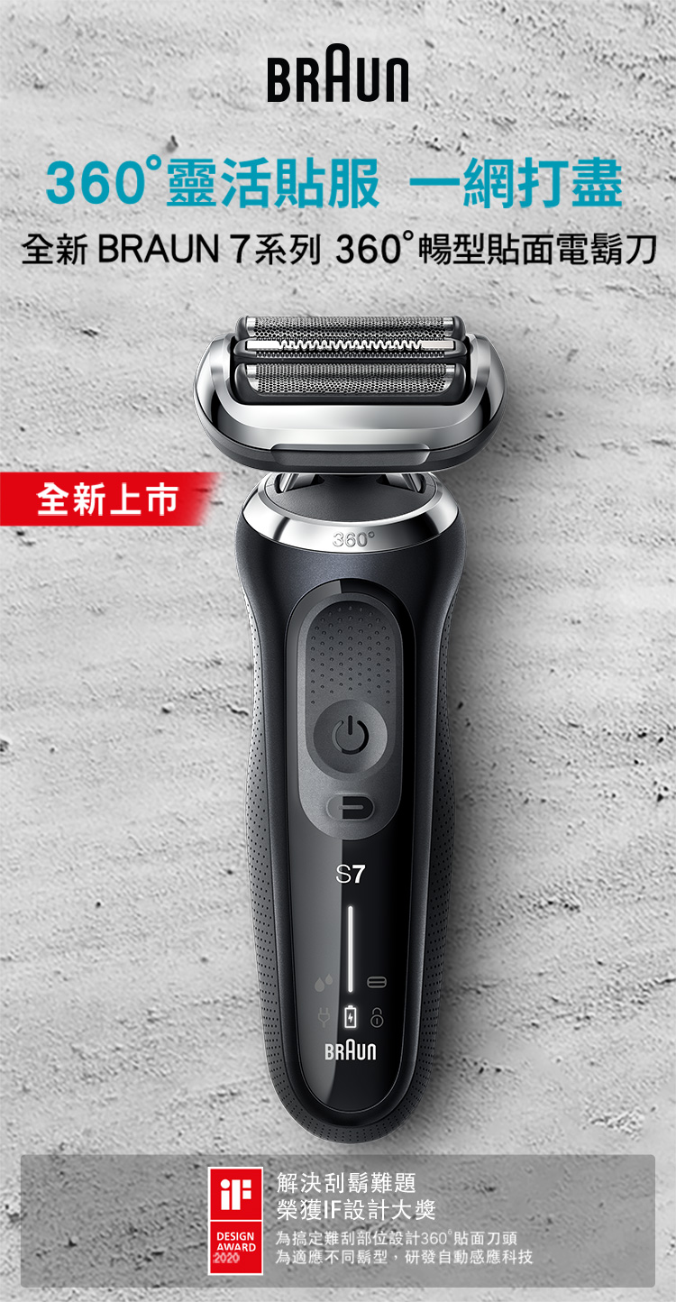 BRAUN 360° Flex - Series 7 智慧電鬚刨配備 360 FLEX 貼面技術,緊貼面部輪廓,征服難剃部位。EasyClick設計能更換不同配件,滿足不同需要,達至有效剃淨厚重鬍鬚。只需一鍵便可帶來充足動力,輕柔剃淨。